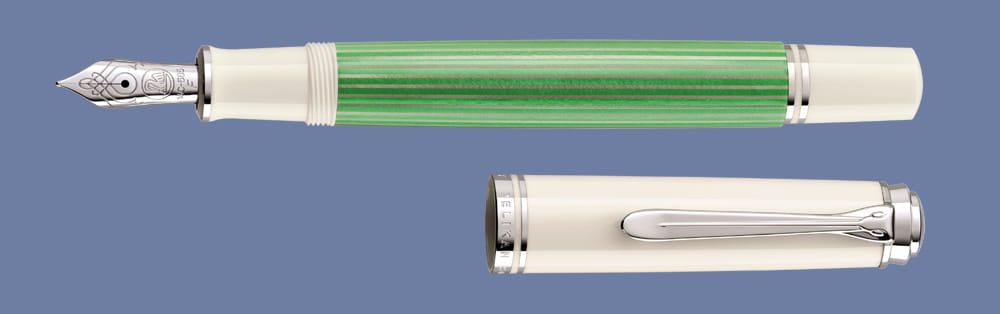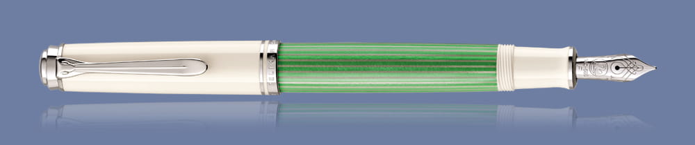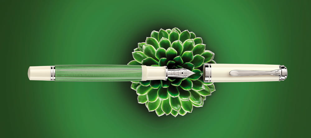 Korpus pióra wykonany jest z celuloidu formowanego w paski w kolorze zielonym oraz przezroczystym, co nadaje instrumentowi niepowtarzalny wygląd. Skuwka oraz sekcja stworzona z białego octanu celulozy są nie tylko piękne, lecz także trwałe i odporne na uszkodzenia. Wykończenia platerowane palladem dodają luksusowego charakteru, a podwójny pierścień na skuwce i klips w kształcie dziobu pelikana podkreślają finezję projektu.