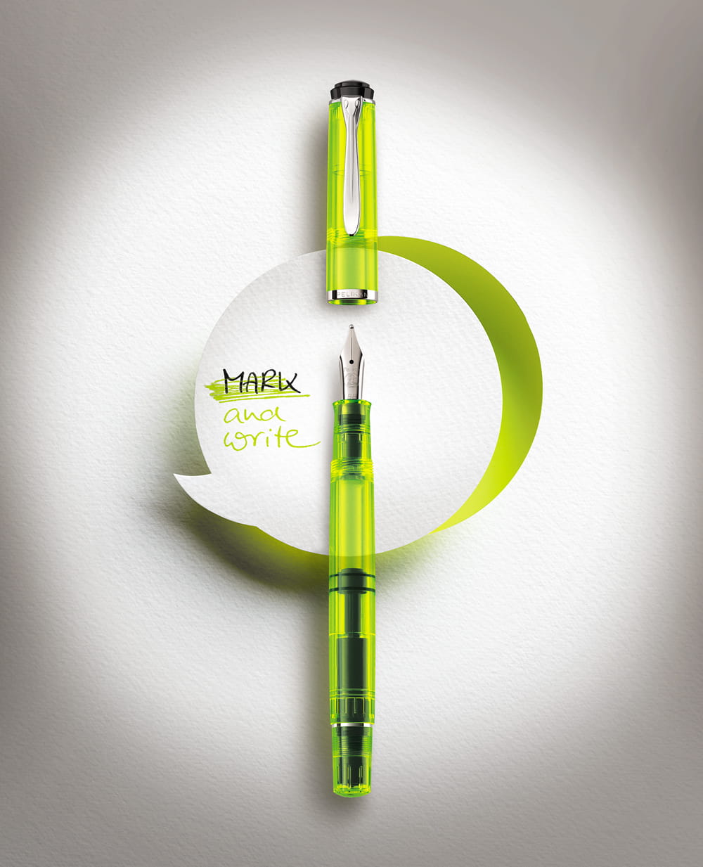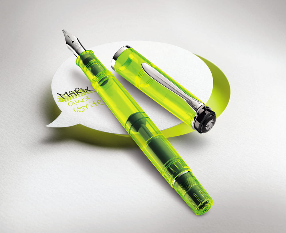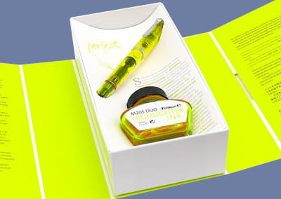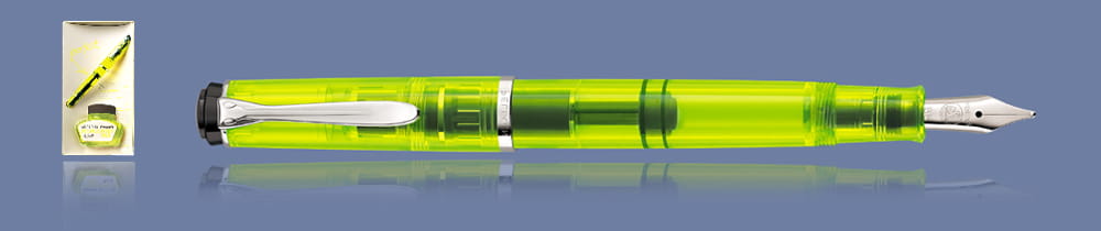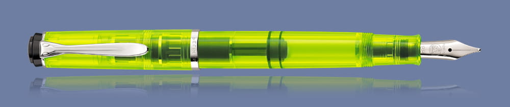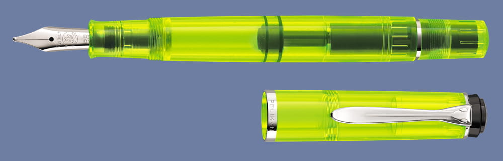 Korpus pióra wykonano z wysokiej jakości octanowej żywicy, zapewniającej trwałość i odporność na uszkodzenia. Elementy wykończenia, w tym chromowane detale, nadają pióru elegancki wygląd i efektowny połysk. Długość zamkniętego pióra to około 12,5 cm, a z założoną skuwką wynosi około 14,7 cm, co czyni go idealnie dopasowanym do każdej dłoni. Zestaw zawiera również atrament Pelikan w szklanej butelce o pojemności 30 ml, który charakteryzuje się doskonałą wydajnością i intensywnością fluorescencyjnego koloru.